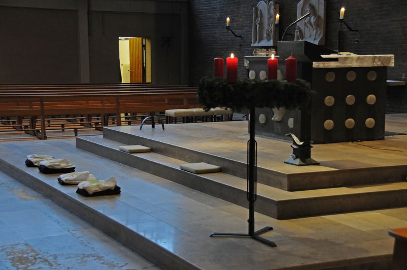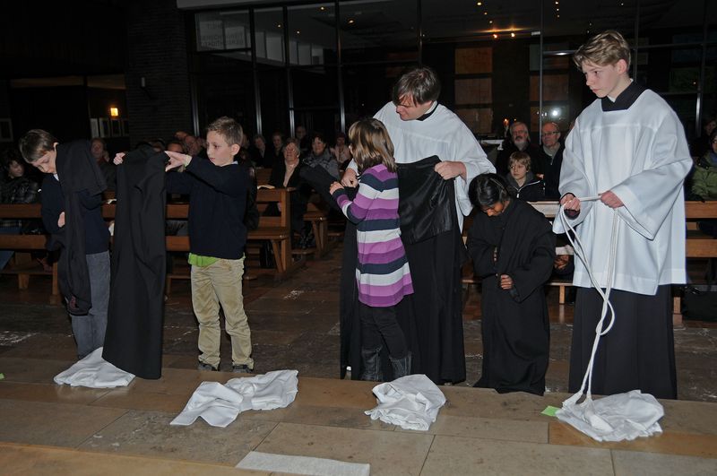 Vier neue Messdiener (zwei Mädchen und zwei Jungen) wurden von Pastor Maurinus Niedzwetzki und den Messdienerleitern Charlotte Wegener, David Hippler und Philipp Willma begrüßt. Die Messdienerkleidung war zu Beginn der Messe vor dem Altar niedergelegt worden.